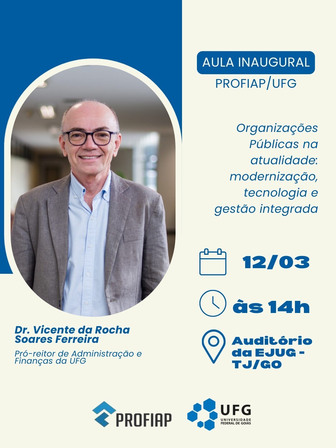 No dia 12/3, com início às 14h, o Profiap-UFG tem o prazer de convidar a comunidade acadêmica do Programa para sua aula inaugural, que será realizada no auditório da EJUG-TJGO. A aula inaugural trará um tema significante para a aprendizagem e conhecimento dos mestrandos, já que contempla a gestão integrada das organizações públicas no contexto de modernização e tecnologia. Professor Vicente da Rocha Soares Ferreira, Pró-Reitor de Administração e Finanças da UFG conduzirá a fala.